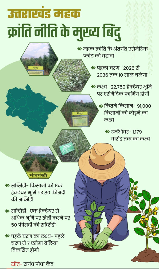 उत्तराखंड महक क्रांति नीति के मुख्य बिंदु: उत्तराखंड महक क्रांति नीति के पहले चरण में अगले 10 सालों यानी 2026 से 2036 तक ये योजना चलेगी. प्रदेश भर में 22,750 हेक्टेयर भूमि पर एरोमैटिक फार्मिंग का लक्ष्य रखा गया है. इस नीति के जरिए 91,000 किसानों को जोड़ने का लक्ष्य रखा गया है.