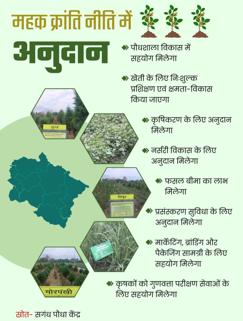 राज्य में एरोमैटिक फार्मिंग को बढ़ावा देने को लेकर सरकार ने उत्तराखंड महक क्रांति नीति लागू की है, 7 एरोमा वैलियां विकसित होंगी..